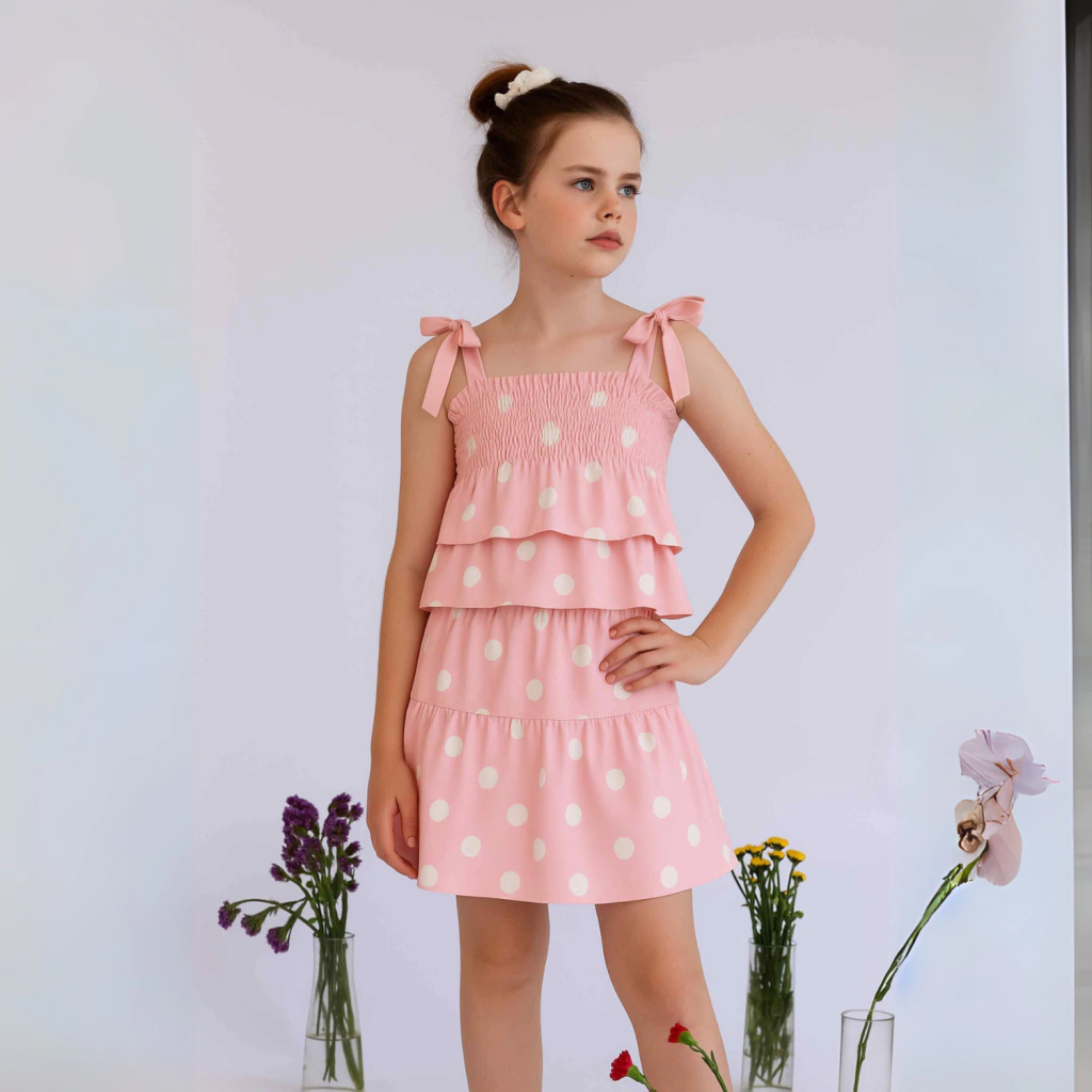 O Conjunto Poá Taty é um encanto! Com estampa clássica de bolinhas, babado delicado e alcinhas com laços, traz um toque divertido e romântico ao visual das pequenas.