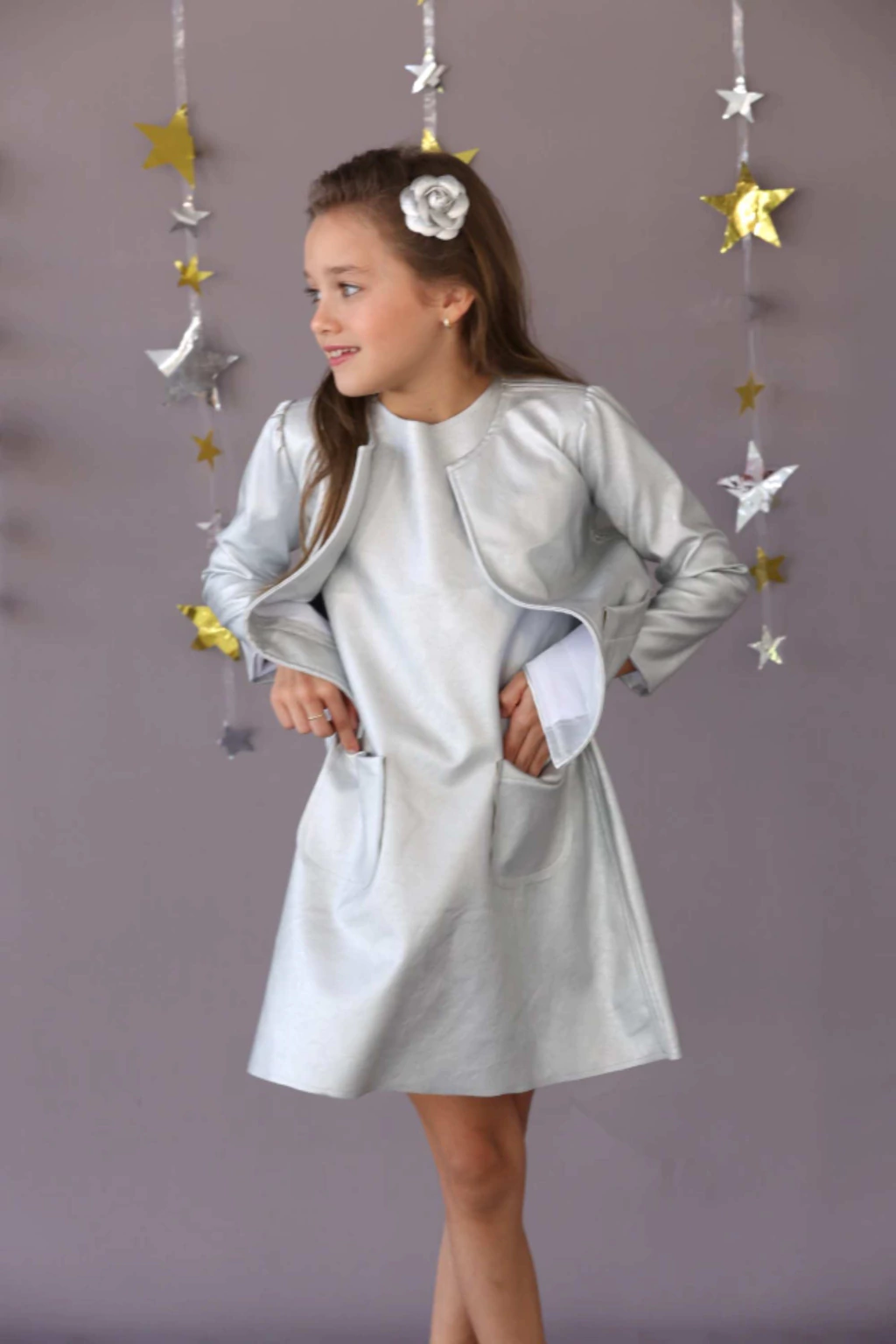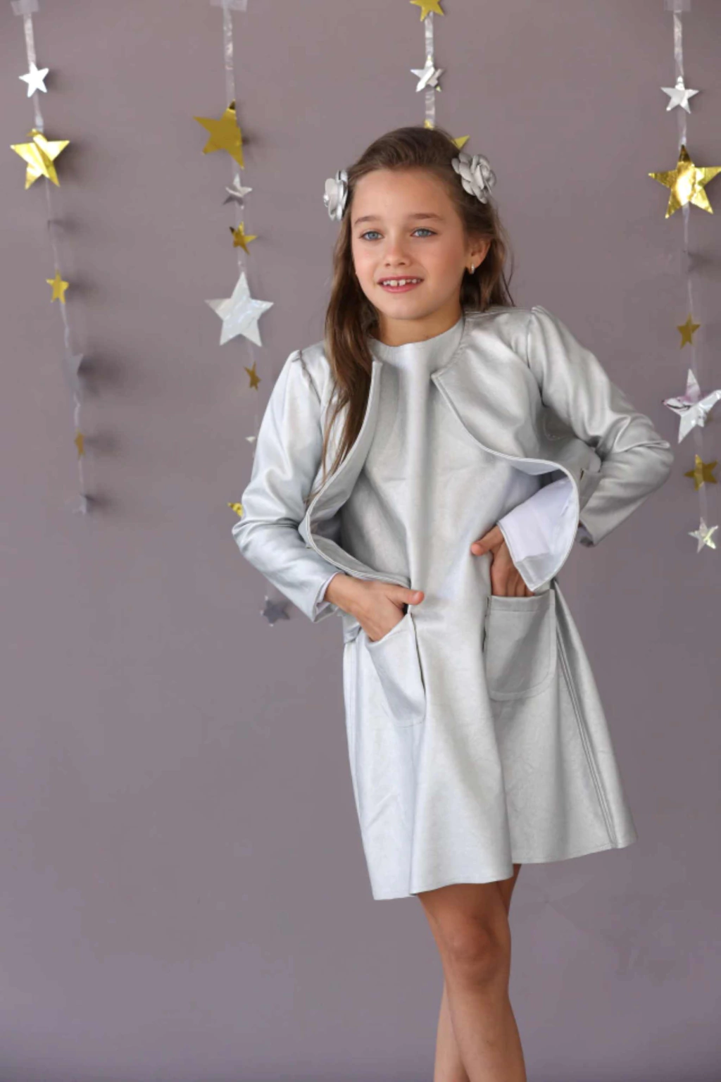 Encantador e sofisticado, este vestido infantil em tom prateado metálico é a escolha perfeita para meninas que desejam brilhar com elegância e estilo em ocasiões especiais. Com um design moderno e atemporal, a peça é confeccionada em tecido de acabamento metalizado que confere um brilho sutil e luxuoso, evocando um ar futurista sem perder a delicadeza da moda infantil.