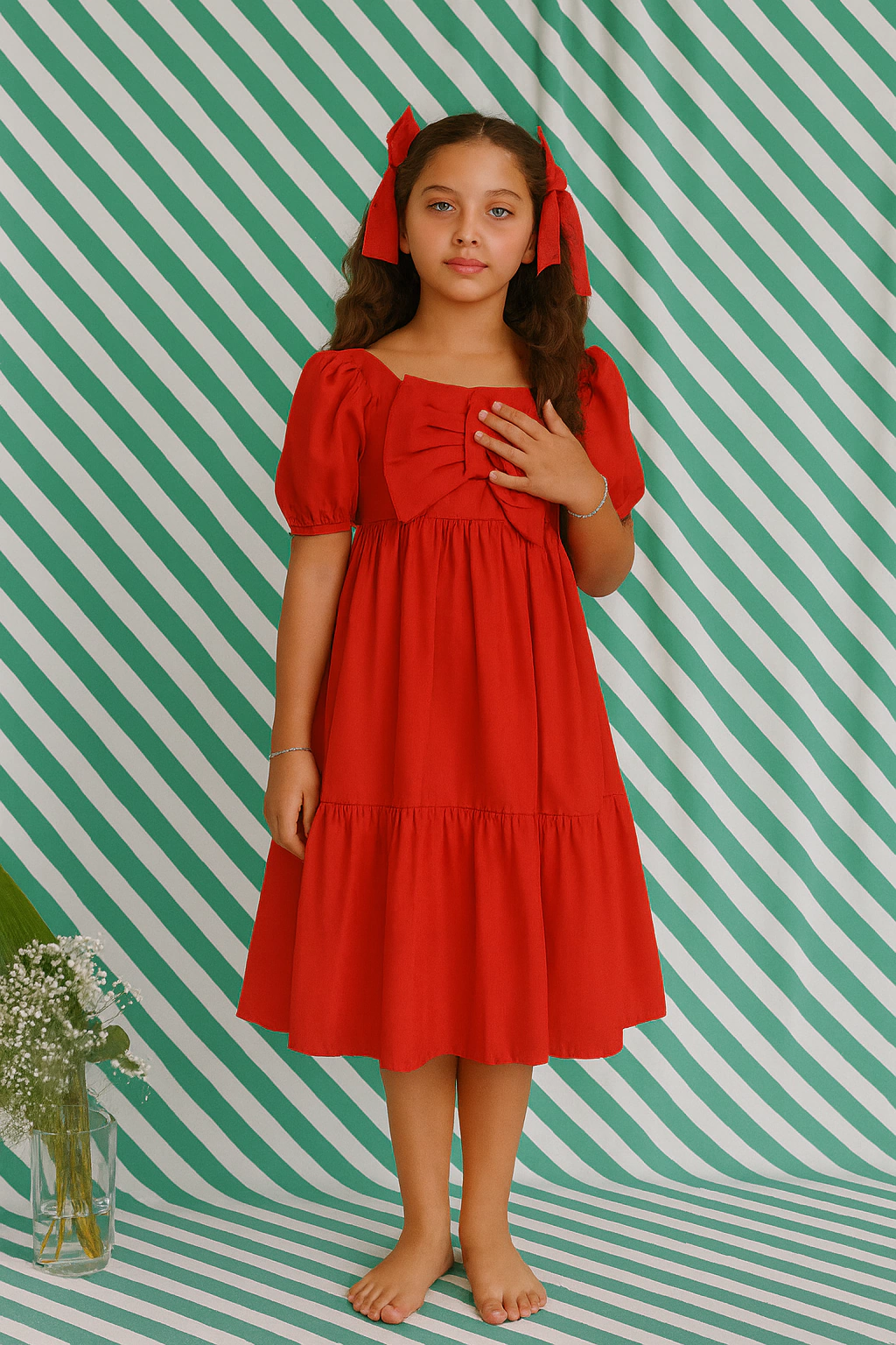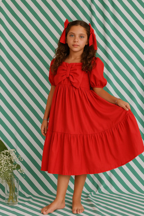 Este vestido infantil vermelho é puro encanto e sofisticação! Com um design atemporal, a peça traz como destaque um maxi laço frontal que enriquece o busto com delicadeza e personalidade. A modelagem midi e o caimento amplo conferem leveza aos movimentos, tornando-o ideal para momentos de alegria e celebração.